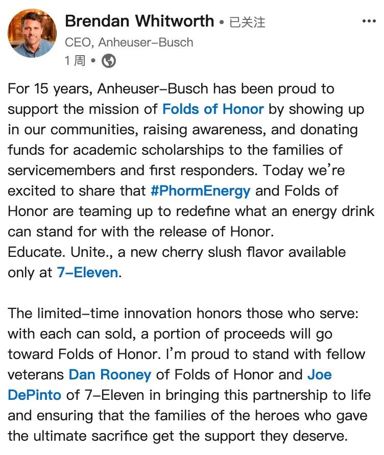 百威英博CEO Brendan Whitworth在领英认证账号中写道:Phorm Energy……redefine what an energy drink can stand for……(英译为:让能量饮料的意义被重新定义)。