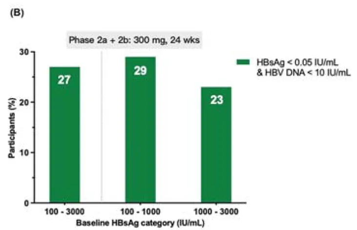治疗24周,联合治疗组的HBsAg总转阴率增加至22/28(79%)(E组为20周数据)。E组有90%的患者在第20周时实现了HBsAg清除,其中E组中有2/10(20%)的参与者早在第4周就实现了HBsAg清除。