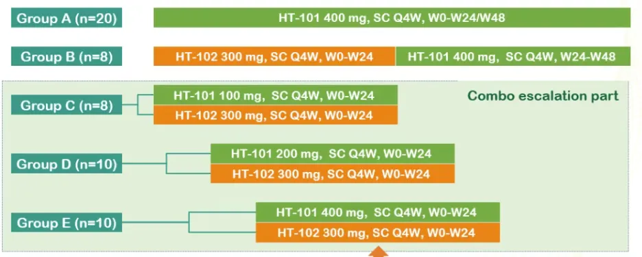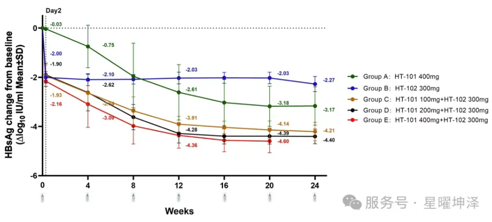 从数据可以看到,HT-101单药治疗可以快速降低HBsAg,但清除不够彻底,HT-101单药降低HBsAg有限。两药联合,可以达到更快速、更彻底清除HBsAg的目标。后续需要继续关注停药后反弹情况,以获得最终的功能性治愈数据。