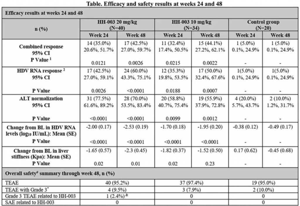 华辉安健HH-003为全球首创的PreS1抗体,目前处于丁肝适应症的上市审评阶段,此前已经获得中国、美国双重突破疗法认定,此次AASLD会议披露的是2b期关键注册性临床数据,HH-003在复合终点应答率、病毒学抑制、ALT复常及肝脏硬度改善方面均显示优异疗效。