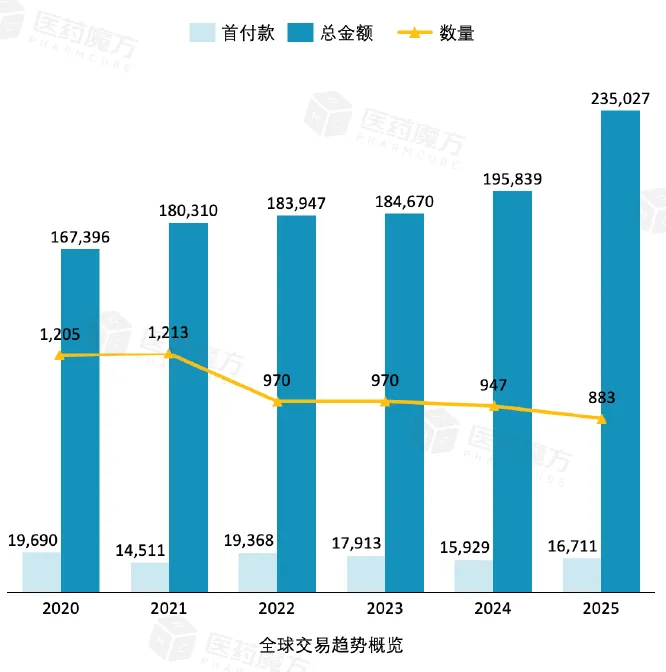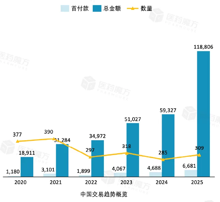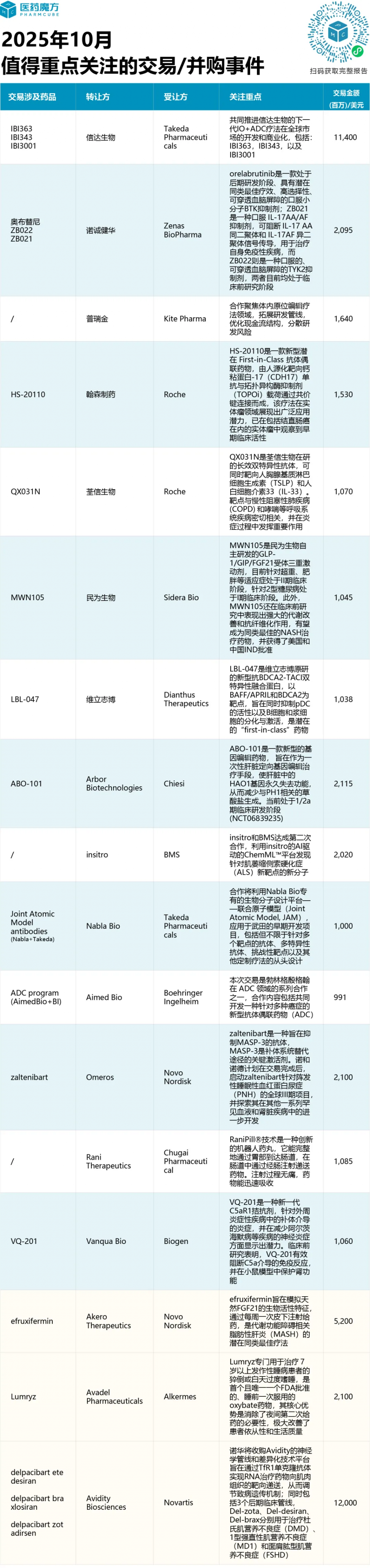 2025年10月全球共计发生85笔交易,首付款金额17.74亿美元,交易总金额359.22亿美元。其中中国相关交易共计27笔,首付款金额15.09亿美元,交易总金额207.19亿美元。