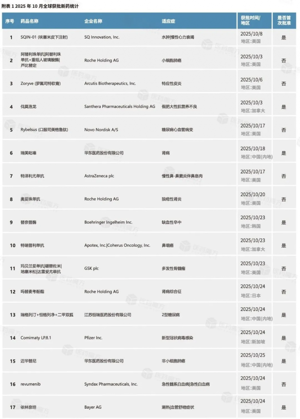 收录范围:主要统计上月中欧美日药监局首次批准以及补充批准的创新药和微创新数据
