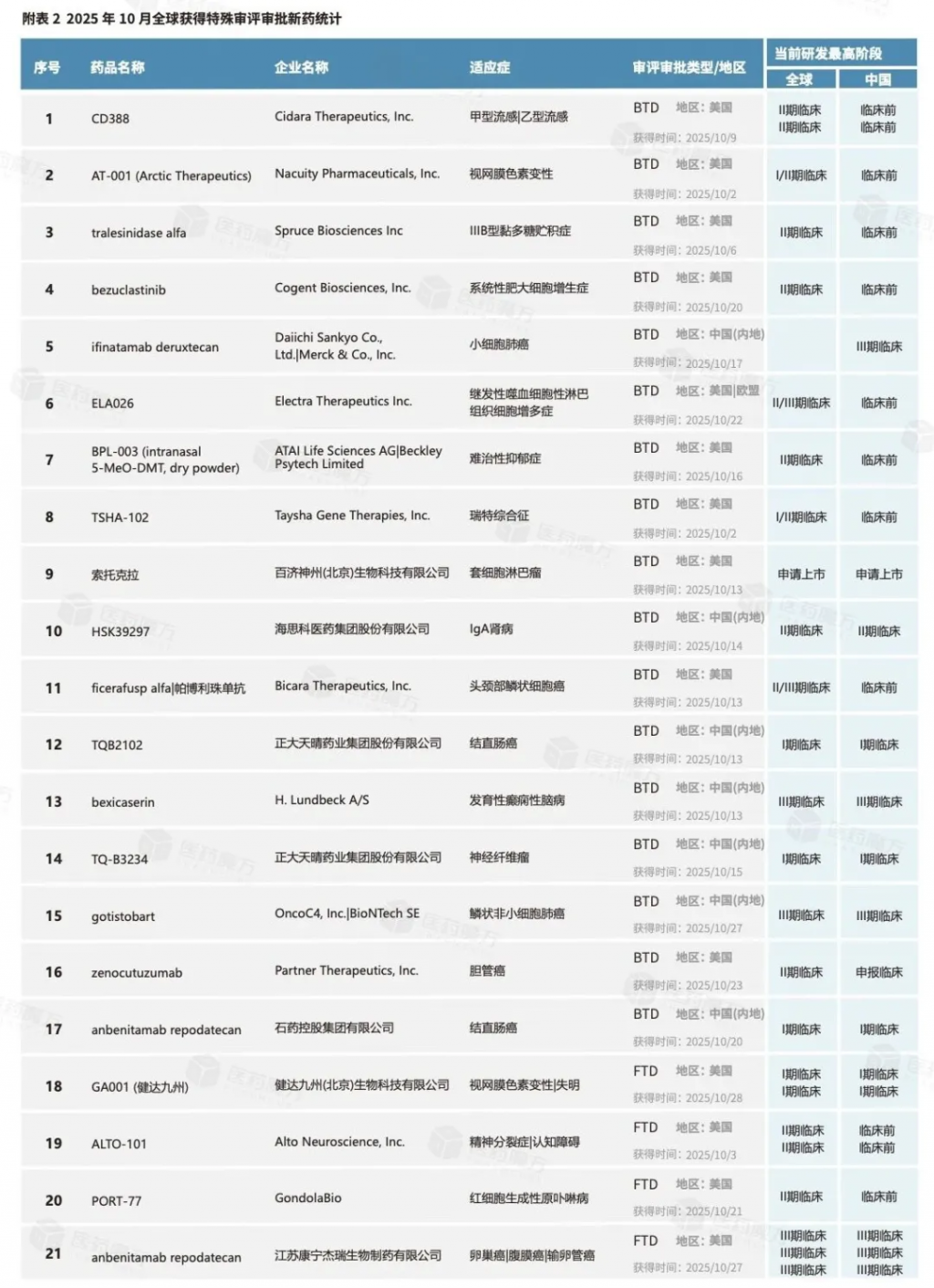 收录范围:主要统计上月中欧美日药监局授予BTD/FTD/ODD/RPDD/RMAT/QIDP/Priority Review的创新药和微创新药品