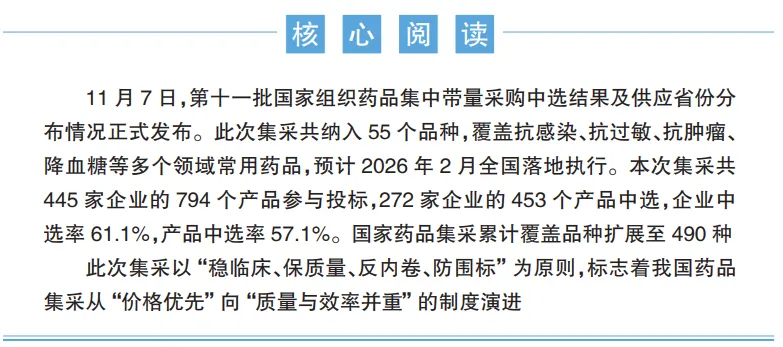 国家药品集采历经7年共11批的实践,已形成“质量前置、反内卷、保临床”的成熟规则体系。第十一批集采在延续“降价提质”目标的基础上,创新十大举措,进一步凸显出国家药品集采的特点和未来发展趋势,为医药行业高质量发展指明了方向。