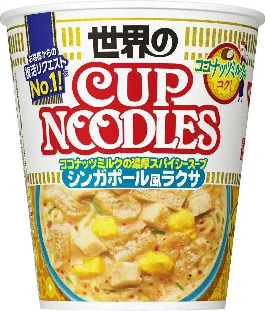 这款产品将新加坡特色料理“叻沙”用“杯面”形式呈现,在2015年发售时,就受到“异国料理爱好者”的喜爱。停售之后,许多顾客都表示“想再吃一次”,它成为“复活请求No.1*”的产品。因此时隔3年,它作为“世界杯面”系列新品之一重新上市。这款杯面以醇厚的椰奶为基底,加入香料后带有辛辣的口感,再配上单独提供的特制叻沙酱和新鲜的香茅,品牌称其“味道令人上瘾”。
