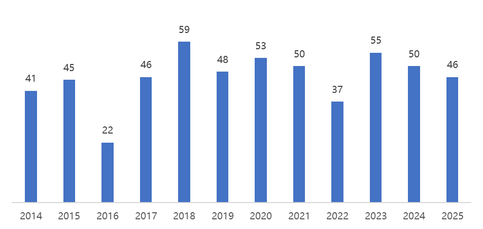 与2024年相比,2025年CDER批准的新药数量有所下降,但first-in-class(FIC)药物数量保持不变。2024年CDER批准了22款FIC药物,占当年所批准新药数量的44%。2025年CDER批准的新药中也有22款为FIC药物,占所批准新药数量的48%。