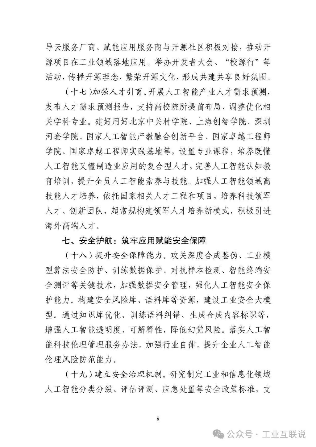 《实施意见》提出,到2027年,我国人工智能关键核心技术实现安全可靠供给,产业规模和赋能水平稳居世界前列。推动3-5个通用大模型在制造业深度应用,形成特色化、全覆盖的行业大模型,打造100个工业领域高质量数据集,推广500个典型应用场景。培育2-3家具有全球影响力的生态主导型企业和一批专精特新中小企业,打造一批“懂智能、熟行业”的赋能应用服务商,选树1000家标杆企业。建成全球领先的开源开放生态,安全治理能力全面提升,为人工智能发展贡献中国方案。