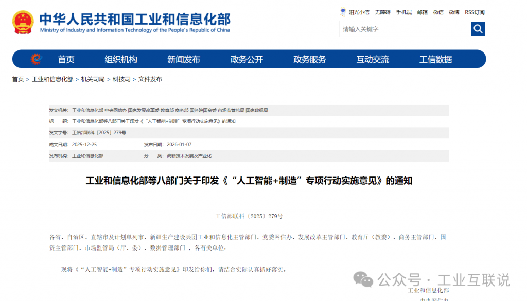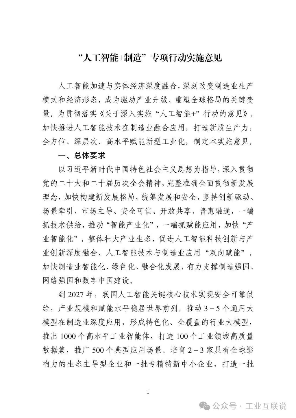 摘要:工业和信息化部等八部门于2025年12月25日联合印发《“人工智能+制造”专项行动实施意见》,并于2026年1月7日正式发布。该文件提出,到2027年,我国人工智能关键核心技术需实现安全可靠供给,产业规模和赋能水平稳居世界前列,具体目标包括推动3至5个通用大模型在制造业深度应用、形成行业大模型、打造100个高质量工业数据集、推广500个典型应用场景,并培育多家全球影响力企业和1000家标杆企业。围绕目标,《实施意见》部署了创新筑基、赋智升级等7方面21项举措,强调通过部门合作与央地联动机制防范产业无序竞争。同时,配套发布《人工智能赋能制造业重点行业转型指引》和《制造业企业人工智能应用指南》,为行业转型和企业实践提供具体路径。