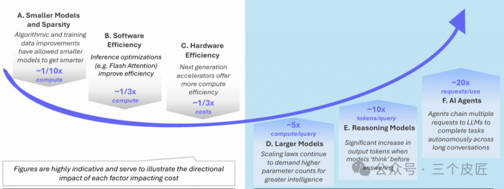 效率的提升来自模型架构优化和软硬件协同。报告显示,达到GPT-4级别的智能,其成本已是原始GPT-4的 1% ,便宜了整整100倍。然而,更大的推理模型和更复杂的智能体任务,也意味着计算需求仍在持续攀升。