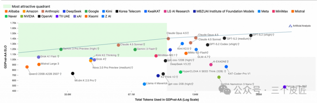 在转向智能体工作流后,一个新的现象出现:输出更多token并不直接等于更高智能。关键在于如何有效使用工具。在长周期智能体任务中,Google和Anthropic的领先模型展现了最佳的“token效率”。