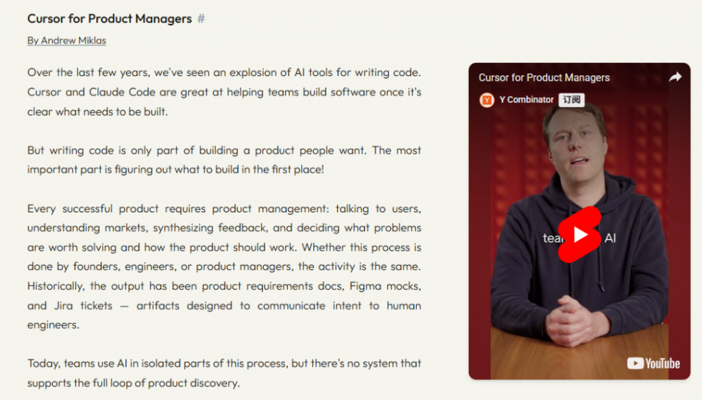 我们认为,构建一个“产品管理领域的Cursor”存在巨大机会:一个专注于帮助团队弄清楚“要构建什么”,而不仅仅是“如何构建”的AI原生系统。随着AI代理越来越多地承担起初步实现的工作,我们定义和传达“要构建什么”的方式也需要改变。如果你正在这个领域探索,我们很乐意收到你的消息。