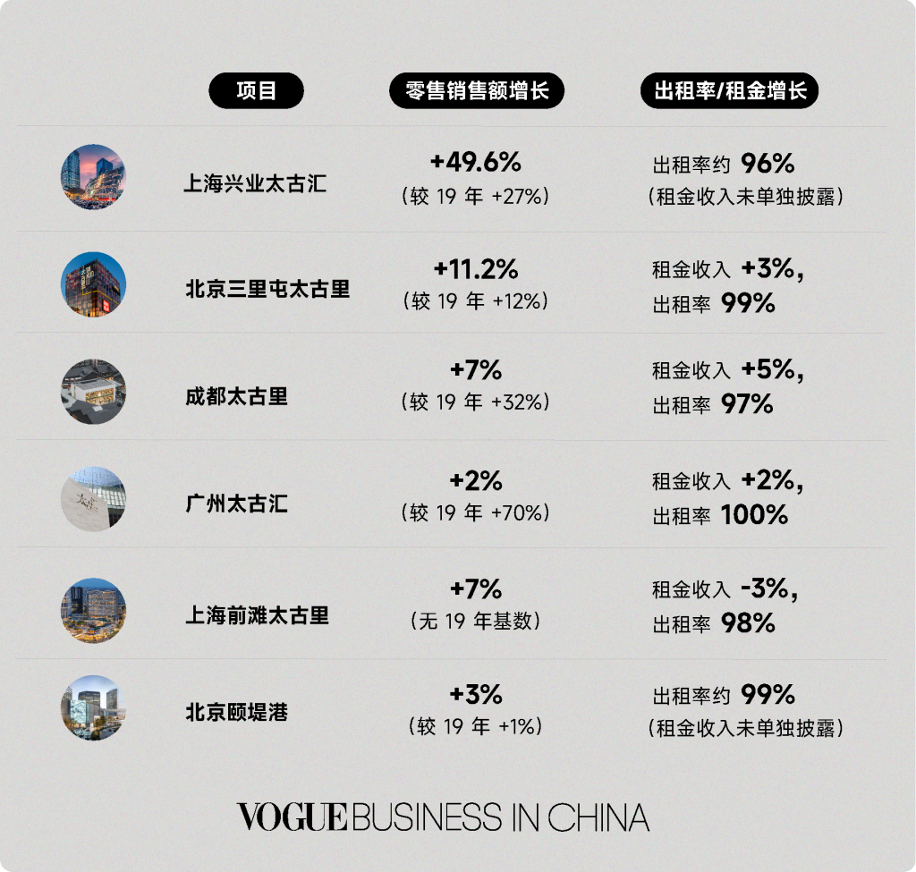 从核心指标出发,这一分化首先体现在一组并不对称的数据上。上海兴业太古汇这一年表现最亮眼,零售销售额同比增长 49.6%,如果和 2019年 相比也有 27% 的提升;出租率大约在 96%,租金收入没有单独披露。