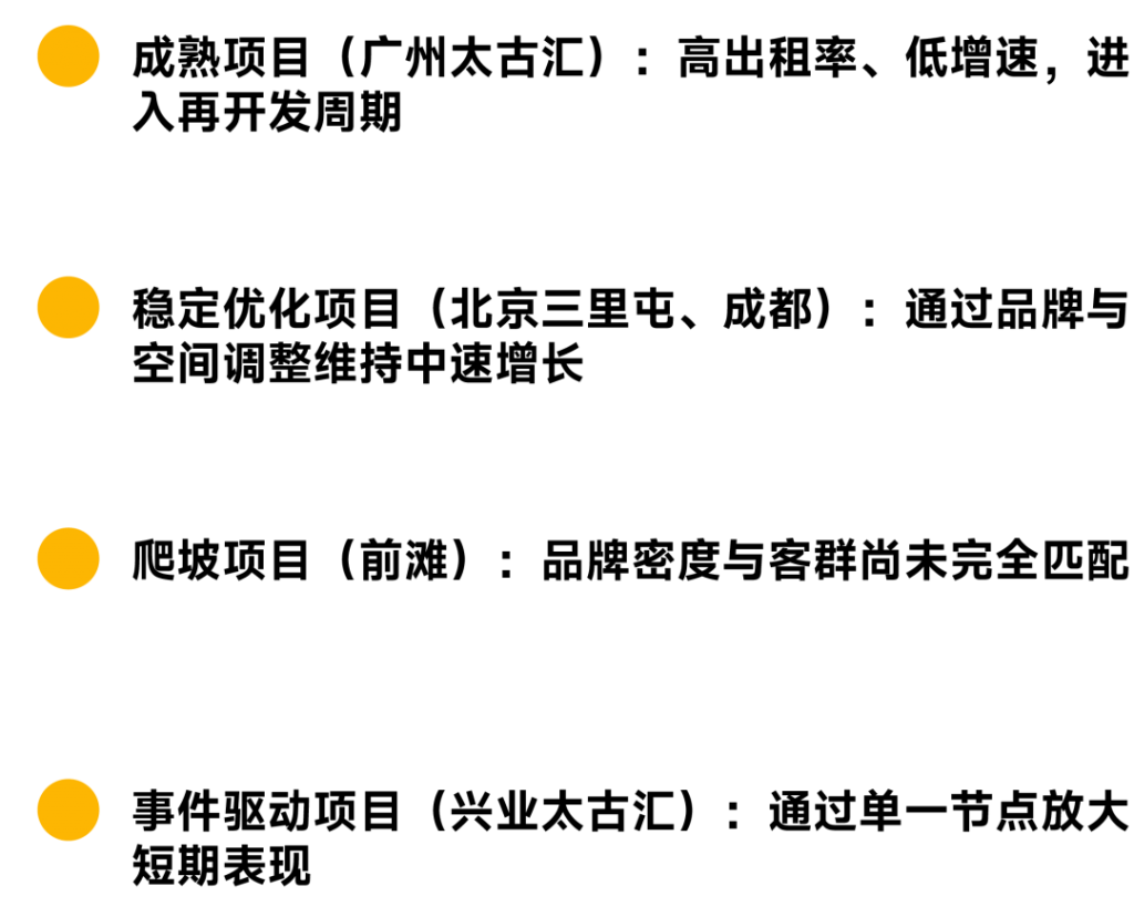 相比之下,上海前滩太古里与北京颐堤港处于不同阶段。前者销售增长 7%、但租金收入下降,反映出品牌结构提升快于客群成熟;后者增长仅 3%,更多依赖交通与区域客流的自然增长。