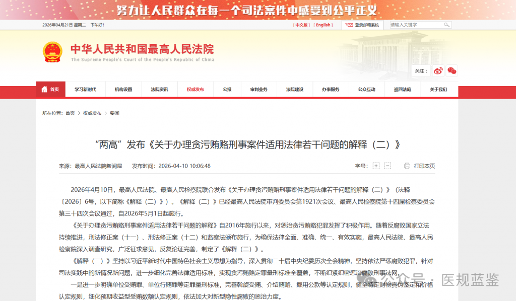 2026年4月10日,最高人民法院、最高人民检察院联合发布《关于办理贪污贿赂刑事案件适用法律若干问题的解释(二)》(法释〔2026〕6号)(以下简称《解释(二)》),自2026年5月1日起施行。