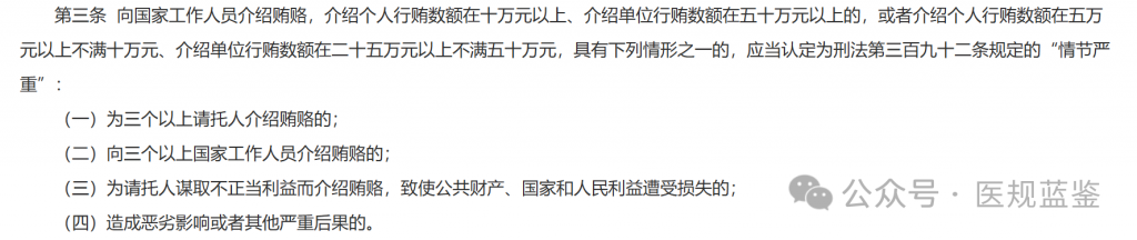明确医药行业介绍贿赂行为的刑事追责标准,搭建行贿、受贿双方利益输送桥梁,充当利益中介的行为,达到对应数额即构成介绍贿赂罪。其中介绍个人向国家工作人员行贿数额累计10万元以上、介绍单位向国家工作人员行贿数额累计50万元以上,均认定为“情节严重”,需承担刑事责任;无论介绍人是否从中获取中介费、好处费,只要实施牵线搭桥、沟通协调、促成贿赂交易的行为,即符合入罪条件,全面打击医药行业中介式、居间式利益输送。