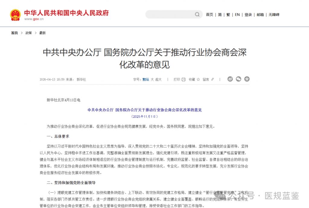 2026年4月13日,中共中央办公厅、国务院办公厅印发《关于推动行业协会商会深化改革的意见》,对新形势下推动行业协会商会深化改革作出了全面谋划、系统设计。