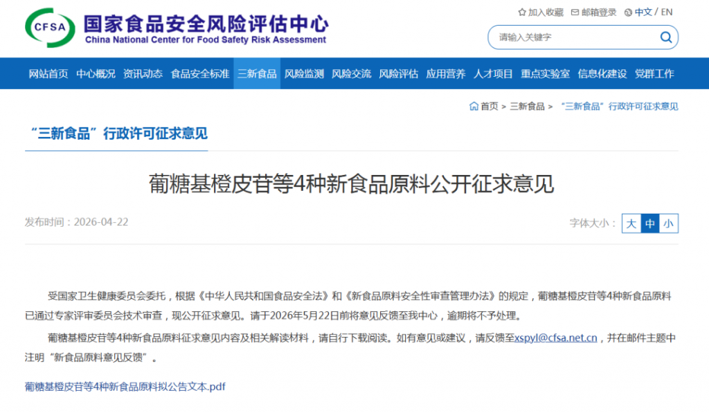 4月22日,国家食品安全风险评估中心信息显示,葡萄糖基橙皮苷、丝素蛋白、γ-聚谷氨酸钠、L-麦角硫因这4种新食品原料申请已正式进入公开征求意见阶段。这一动态标志着这些备受瞩目的成分距离在中国市场获得“合法身份”又迈出了关键一步。