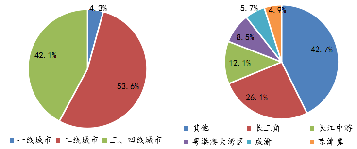 图:2020年1-8月50家代表房企拿地面积城市等级、区域分布情况