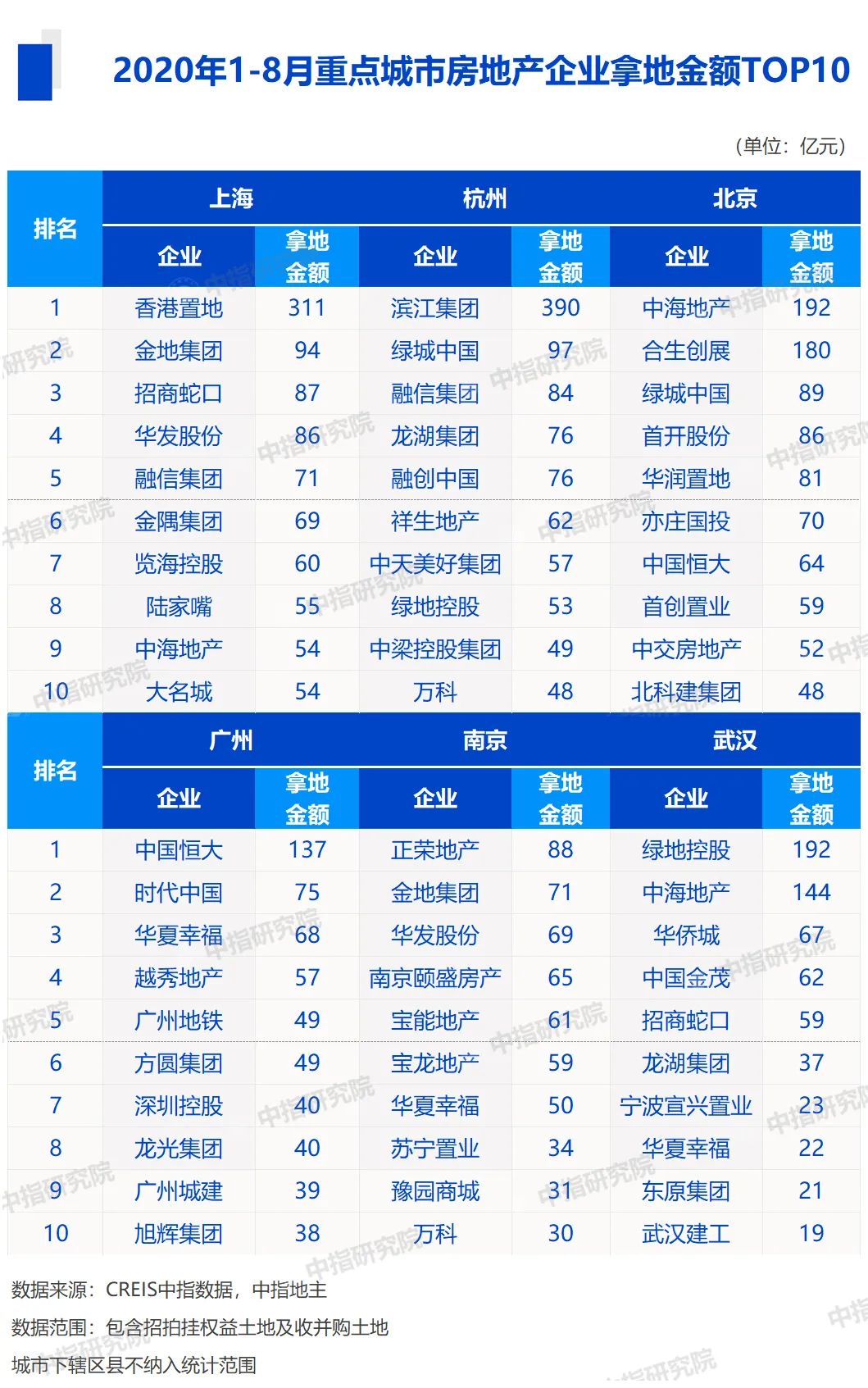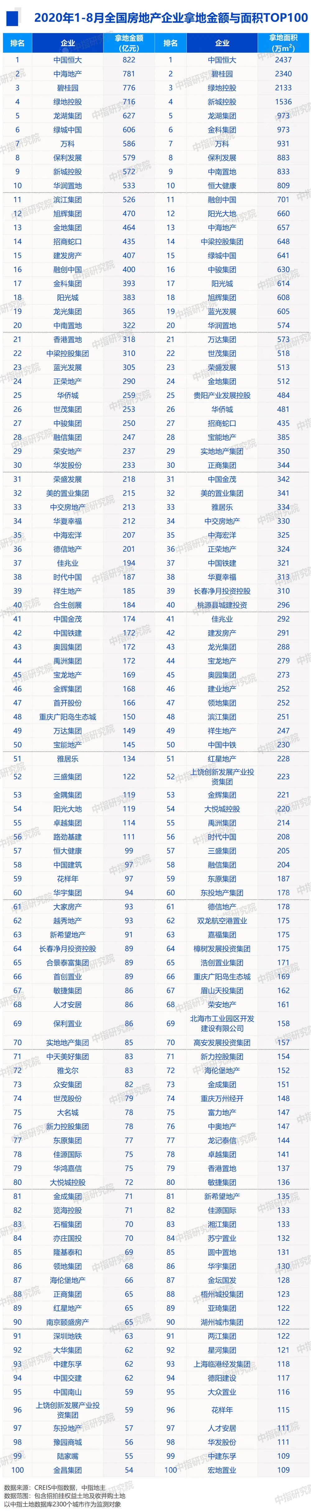 2020年1-8月,TOP100企业拿地总额21162亿元,拿地规模同比增长7.2%。TOP100门槛值升至54亿元,环比增长10.2%,TOP100企业招拍挂权益拿地总额占全国300城土地出让金的比例为55.2%。