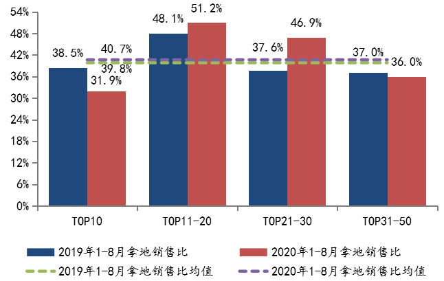 图:2020年1-8月50家代表房企各阵营拿地销售比