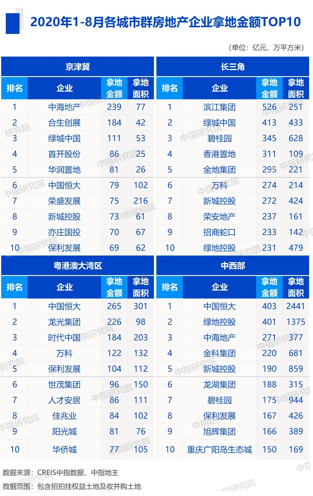 从各城市群拿地金额来看,长三角热力不减。1-8月,长三角TOP10企业拿地金额3137亿元,依旧位居四区域首位;中西部TOP10企业拿地金额2331亿元,位列第二。拿地面积来看,中西部TOP10企业拿地面积以7976万平方米位居四区域首位,继续领跑。值得关注的是,香港置地今年2月以311亿元拿下上海徐汇区地块,刷新了全国总价地王记录,并凭借该地块位居1-8月长三角拿地金额第四。