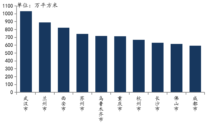 中西部省会城市与城市群内热点城市颇受青睐。1-8月,50家代表房企拿地TOP10城市中,中西部省会城市占7席,其中武汉、兰州和西安分列前三位,重庆、长沙及成都也较受欢迎;长三角城市群有两个城市上榜,苏州、杭州分别位居第四、七位;粤港澳大湾区城市群中的佛山热度持续,拿地面积位居第九位。