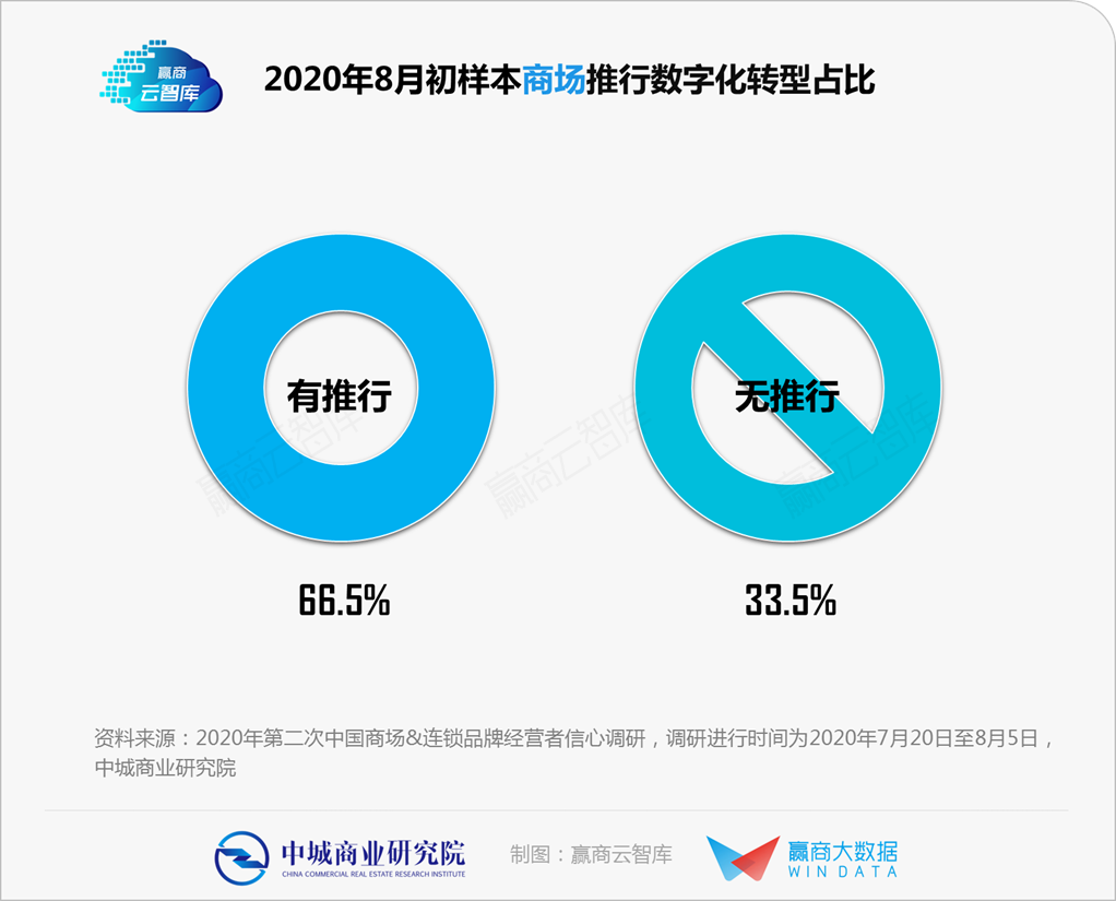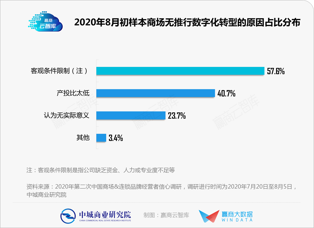 截至8月初,样本商场推行数字化转型的比重为66.5%;无推行数字化转型的样本商场之中,有57.6%认为是受到客观条件限制(例如缺乏资金、人力,或对数字化转型的专业度不足等);40.7%认为产投比太低,不符合经济效益;此外,亦有23.7%认为无实际意义。