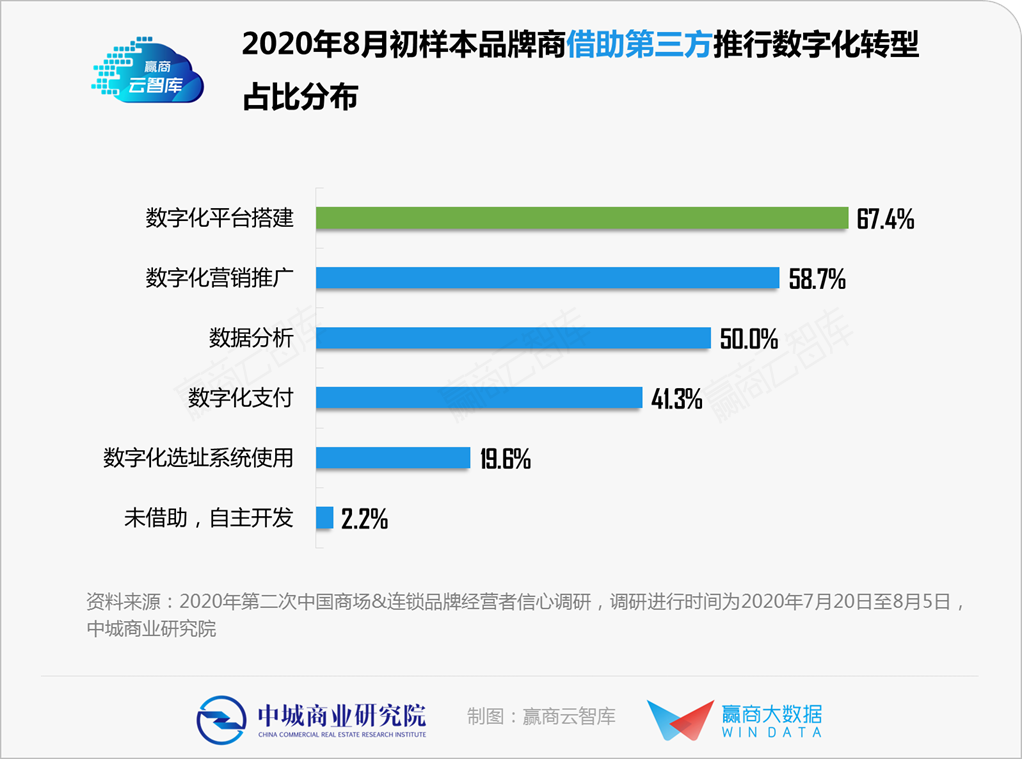 根据调研结果,有97.8%的样本品牌商使用第三方服务推行数字化转型,其中又以“数字化平台搭建”最为普遍,占比达67.4%;选择“数字化营销推广”、“数据分析”的比例分占第二、第三位,比重均超过5成。