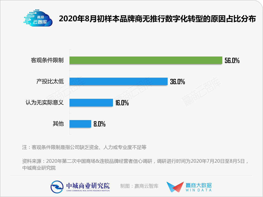 无推行数字化转型的样本品牌之中,受到“客观条件限制”同样占据首位,比重达56%;认为“无实际意义”的比例仅16%,显示不同于商场重心在于实体渠道“场的运营”,品牌商更看重的是将商品销售出去。
