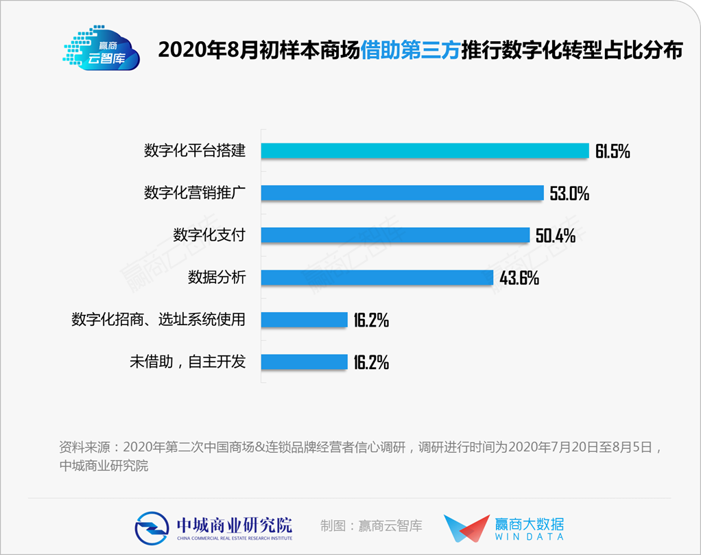 调研结果显示,有83.8%的样本商场在推行数字化转型的过程中,借助第三方支援。其中,“数字化平台搭建”占比超6成,比重最高;“数字化营销推广”、“数字化支付”的比重均超过5成。