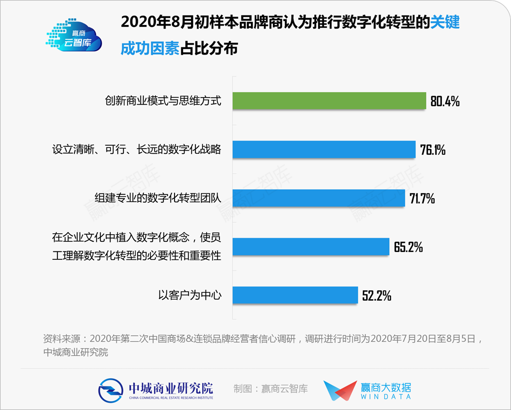 从样本品牌商认为推行数字化转型的关键成功因素来看,以“创新商业模式与思维方式”最重要,占比高达80.4%。唯有持续创新求变、推陈出新,才能更好、更快的贴近消费者快速变化的喜好,进而立于不败之地。