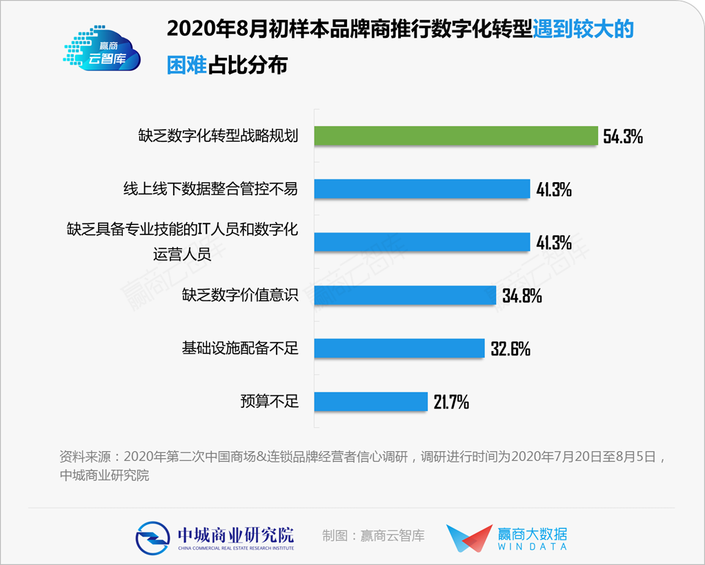 从样本品牌商推行数字化转型遭遇到的困难来看,有54.3%面临“缺乏数字化转型战略”的问题,使得经营者在数字化转型的方向、定位及选择等方面难以形成长期、连贯、稳定的计划,推行进程受阻。