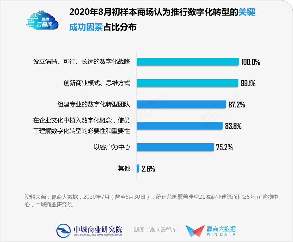 从样本商场认为推行数字化转型的关键成功因素来看,所有样本商场一致认为,“设立清晰、可行且长远的数字化战略”,为成功转型的首要因素;选择“创新商业模式、思维方式”的比例亦高达99.1%。