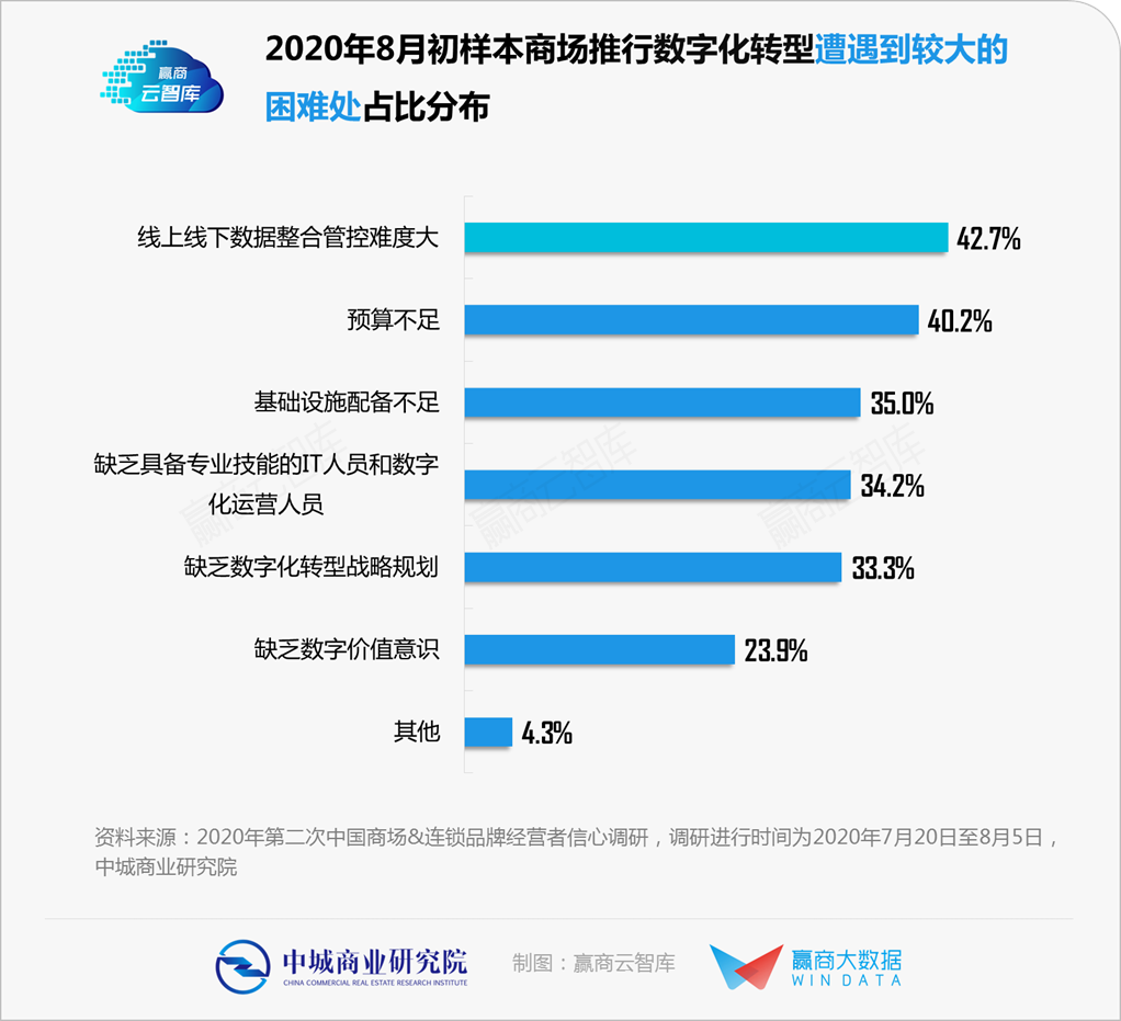 从样本商场推行数字化转型遭遇到的困难来看,有42.7%的样本商场认为在对线上线下数据进行整合、管控时,面临较大的困难。由于线上线下数据的分割容易形成“数据孤岛”,一定程度限缩了数字化效用的完整发挥。
