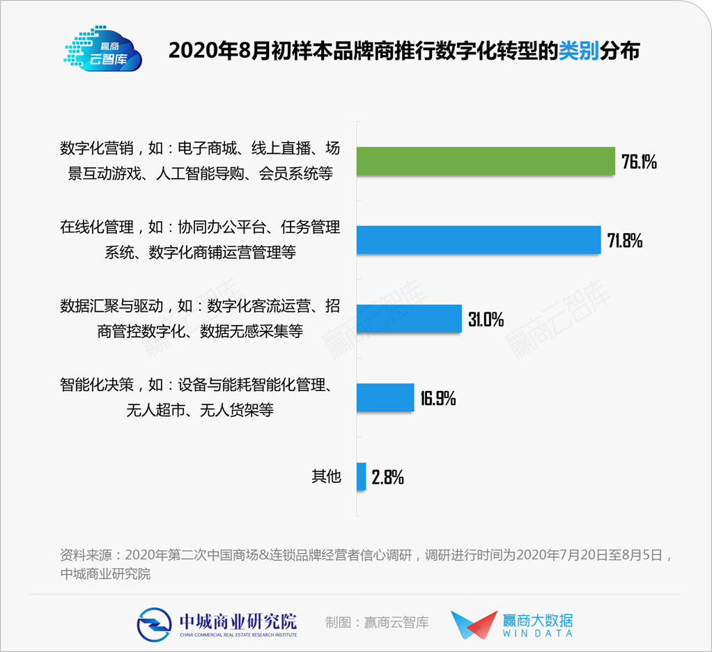 截至8月初,样本品牌商推行数字化转型的比重高达74.0%,显示其对于数字化的接受程度与普及程度均较商场来的高,此一结果与品牌商家的业态属性高度关联(例如餐饮外卖、服饰电商旗舰店等),尤其新冠疫情的发生,更是品牌投向数字化转型的关键推手。