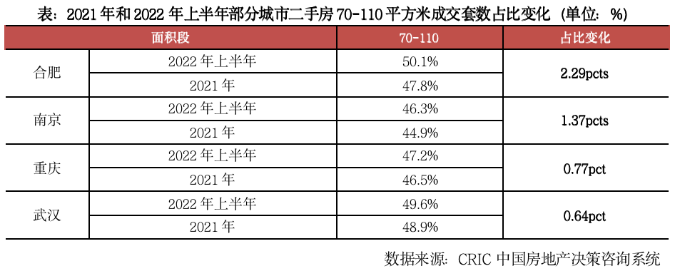 对比2021年和2021年上半年成交结构数据,合肥和南京70-110平方米二手房成交占比分别上升2.3pcts和1.4pcts。重庆和武汉占比也分别上升了0.77pct和0.64pct。四城2022年上半年70-110平方米二手房成交占比均为50%左右,即刚需产品成为上半年二手房成交主力。
