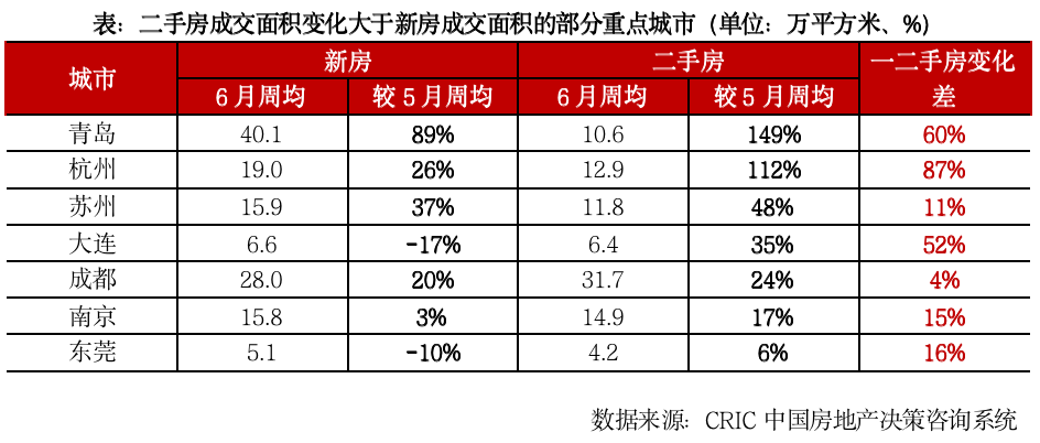 青岛、杭州、苏州等多个重点城市二手房市场恢复速度显著快于新房市场。3月起密集的调控政策救市下,多城房地产市场均处于积极修复中。对比重点城市新房和二手房5月和6月周均成交面积,二手房市场已大幅抢先复苏。