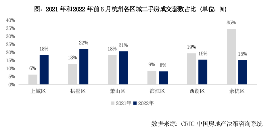 具体以杭州为例,对比2022年前6月和2021年,上城区和拱墅区(包括原下城区)二手房成交套数占比分别上升了12pcts和9pcts。毗邻滨江区的萧山区占比上升3pcts。而余杭区占比则由35%下降至15%,降幅达20pcts。