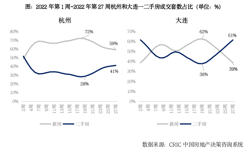 以杭州和大连为例,2022年第20周(5月9日-5月15日)杭州和大连新房成交分别占整体规模7成和6成。而随着二手房成交逐渐升温,新房市场成交份额不断被蚕食。至第27周(6月27日-7月3日),大连新房成交规模仅占整体的39%,杭州新房占比也下降了13pcts。
