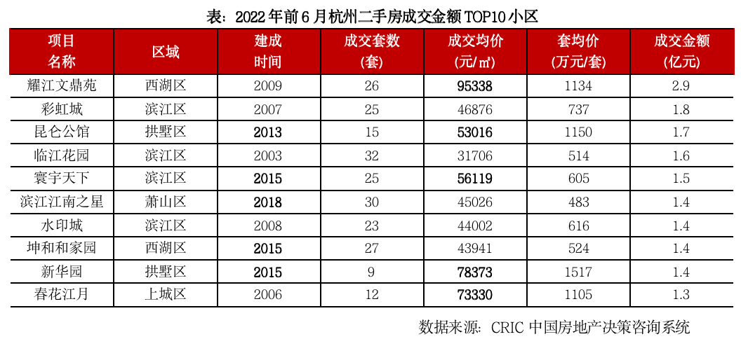 2022年前6月成交金额TOP10的二手房小区中,全数位于西湖区、滨江区、拱墅区、上城区等中心城区。半数以上为2010年以后建成的“次新房”,如昆仑公馆、寰宇天下、滨江江南之星、坤和和家园和新华园。其中不乏数个单套均总价超千万的豪宅项目,如耀江文鼎苑套均总价1134万元,前6月共计成交2.9亿元、26套,成交均价9.5万元/平方米。