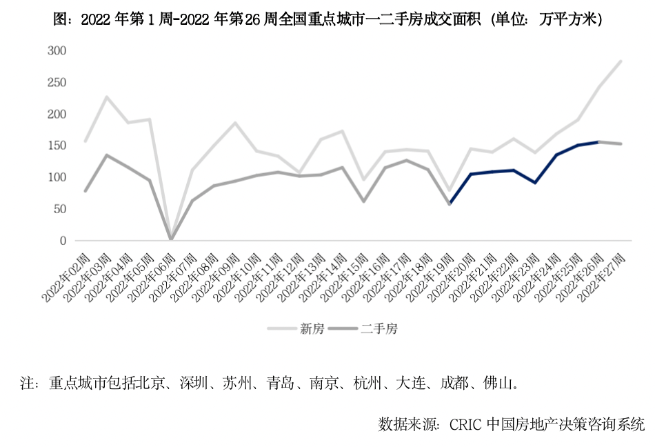综合11个重点城市二手房成交情况来看,2022年第20周(5月9日-5月15日)起成交规模四连增。至第27周(6月27日-7月3日)成交规模达152万平方米,较第20周增长41%,并创年内新高。