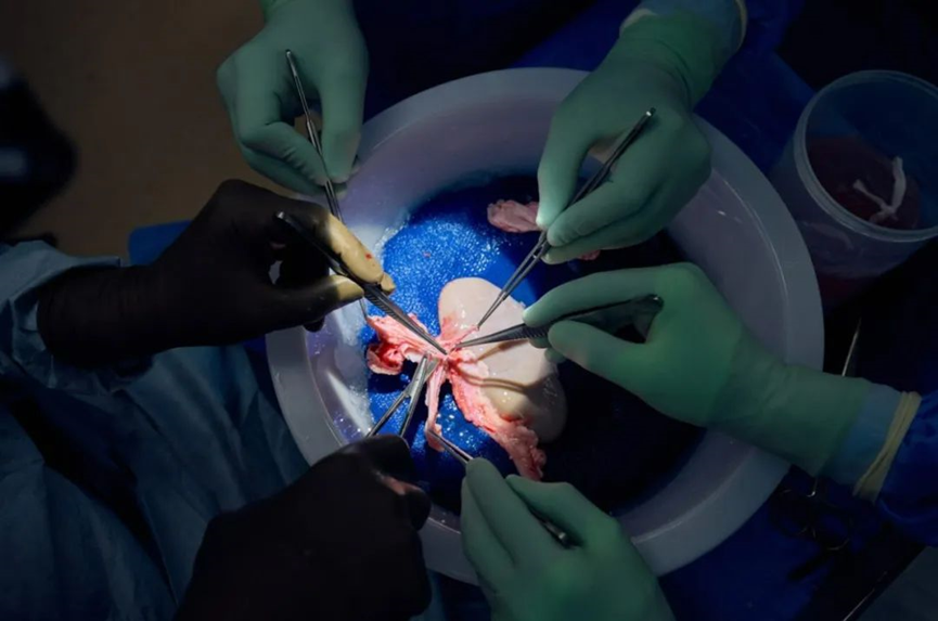 ▲研究团队正在去除猪肾脏多余的组织,准备用于人体移植(图片来源:Joe Carrotta for NYU Langone Health)