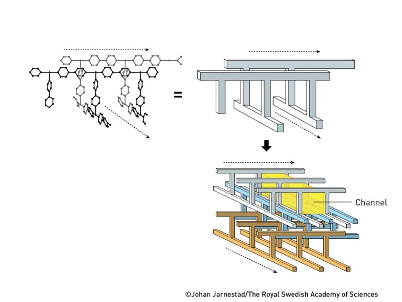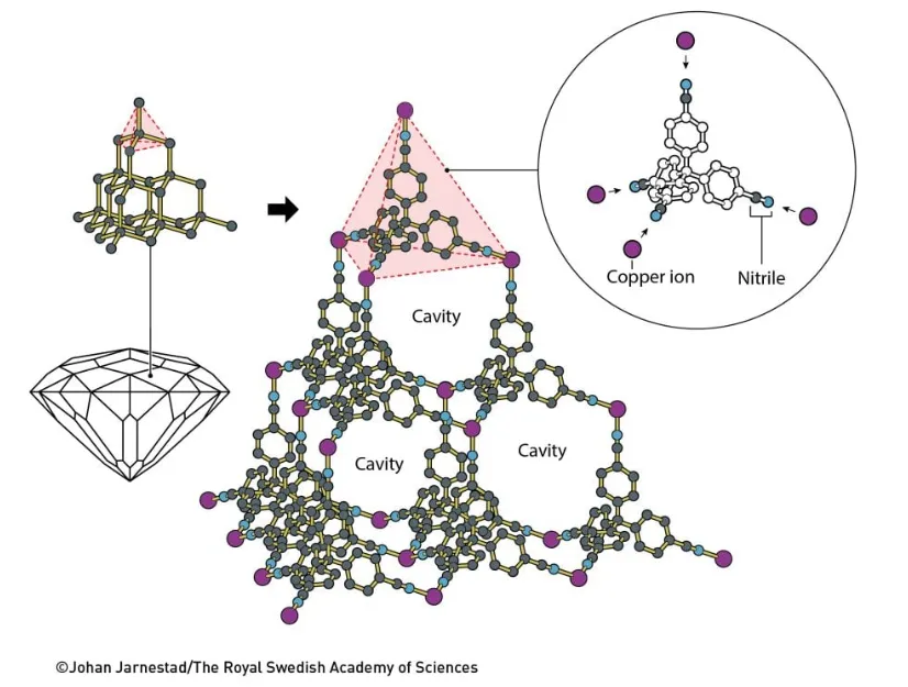 另一位获奖者Richard Robson教授的故事始于1989年,当时他尝试以全新方式利用原子的固有特性。他将带正电荷的铜离子与一种四臂分子结合——每个分子臂末端都具有易与铜离子结合的化学基团。当两者结合时,它们形成了结构有序、空间开阔的晶体。这就像一颗布满无数腔体的钻石。Robson教授立刻意识到这种分子构造的潜力,但其结构不稳定且易坍塌。