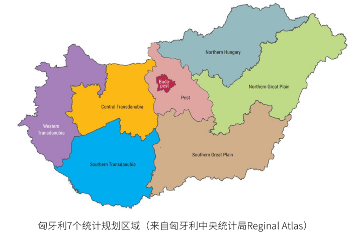 为便于统计规划,匈牙利19个州和首都布达佩斯组合为7个统计规划区域:多瑙河西部(匈 语:Nyugat-Dunántúl,英语:WesternTransdanubia)、多瑙河中部(匈语:Közép-Dunántúl,英语:Central Transdanubia)、多瑙河南部(匈语:Dél-Dunántúl,英语:Southern Transdanubia)、匈牙利中部(包括佩斯州和布达佩斯市,匈语:Közép-Magyarország,英语: Central Hungary)、匈牙利北部(匈语:Észak-Magyarország,英语:NorthernHungary)、 北部大平原(匈语:Észak-Alföld,英语:NorthernGreatPlain )和南部大平原(匈语:Dél-Alföld, 英语:SouthernGreatPlain)。