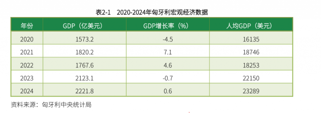 近年来,匈牙利经济呈良好发展态势。根据匈牙利中央统计局数据(下同),2024年匈牙 利国内生产总值(GDP)为81万亿福林(约2221.8亿美元),增长0.6%,人均GDP为2.3万美元。