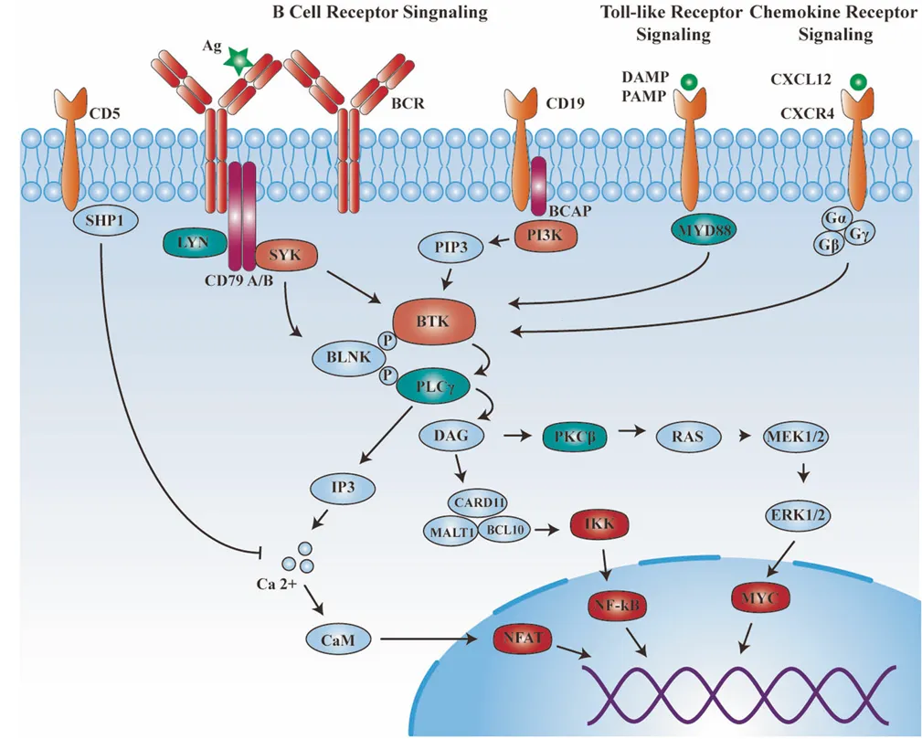在肿瘤治疗领域,BTK已成为一个备受瞩目的明星靶点。BTK作为一种非受体酪氨酸激酶,广泛参与B细胞的发育与活化过程。在生理状态下,BTK介导B细胞受体信号传导,调控细胞的生存与增殖;然而,当B细胞发生癌变时,BTK会异常活化,持续传递促生长信号,驱动肿瘤细胞的增殖、迁移和存活,从而促进B细胞恶性肿瘤的发展,如慢性淋巴细胞白血病、套细胞淋巴瘤等。