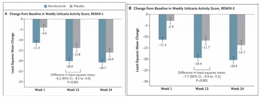 Remibrutinib针对慢性自发性荨麻疹的REMIX-1/2 两项III期临床试验结果显示:与安慰剂相比,Remibrutinib在治疗第12周时显著改善每周荨麻疹活动度评分(UAS7)(图3)、每周瘙痒严重程度评分(ISS7)和每周风团数量评分(HSS7),且这种疗效持续至第24周。更值得注意的是,药物起效迅速,治疗第1周即可观察到症状减轻;到第24周时,半数患者症状得到控制,约30%患者瘙痒和荨麻疹完全消失。