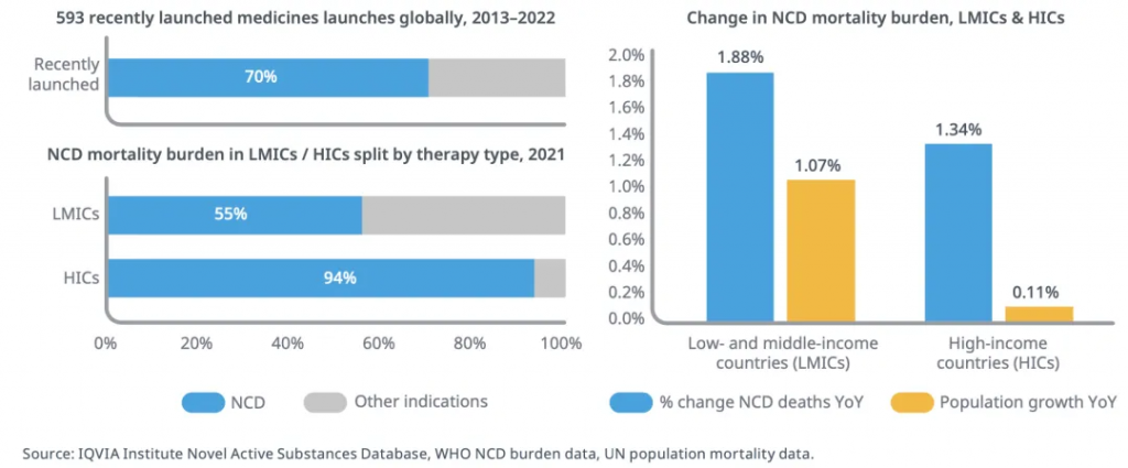 图1:新上市药品中NCD的构成情况,以及LMICs和高收入国家(HICs)的NCD死亡负担及趋势