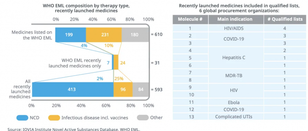 新上市的传染病药物中有25%被纳入WHO EML,而同期上市的NCD药物中仅有2%被纳入该清单。