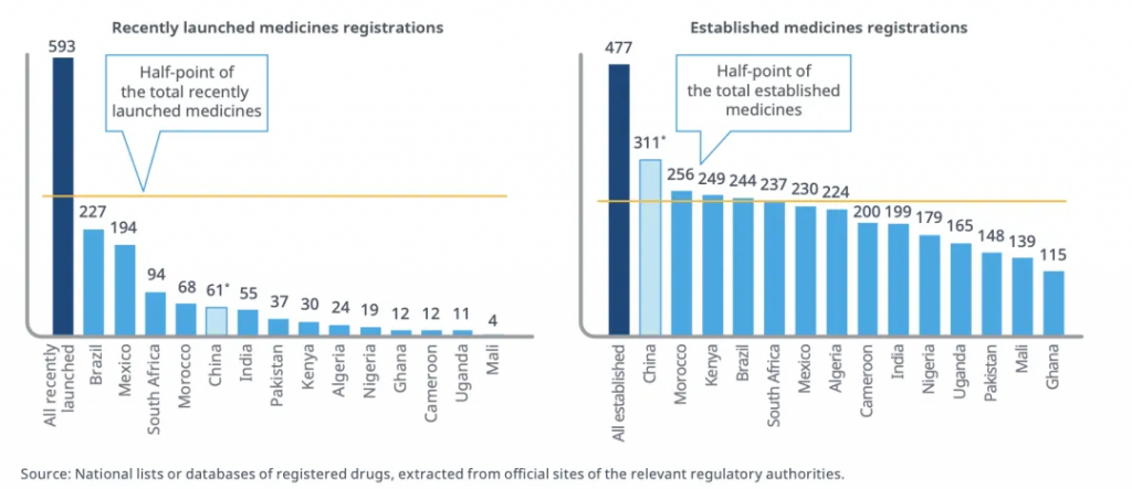 有些国家的药品注册率一直很低,无论是新上市的还是已在市药品。例如,马里、乌干达、加纳和尼日利亚在新药和已在市药品的注册数量方面均处于倒数五位。